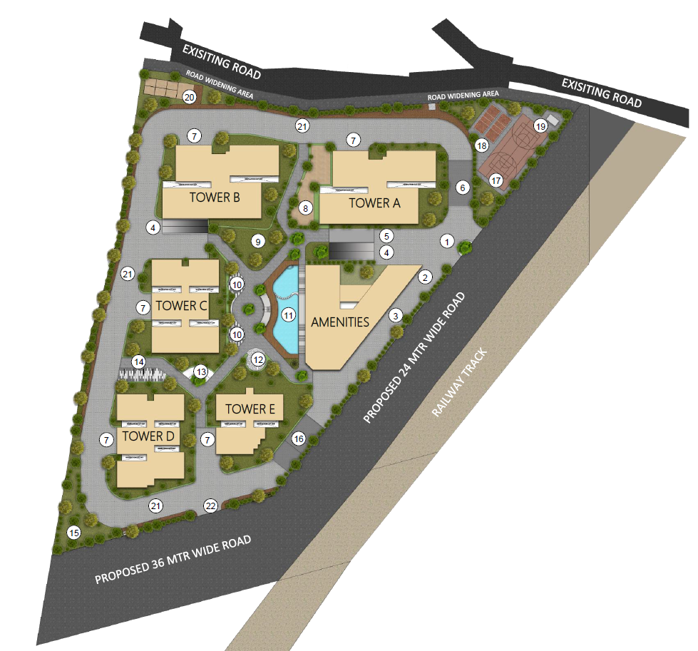 Landscape gardens and Outdoor seating create a refreshing ambience accompanied with recreational activities (such as basketball and volleyball courts), Kids sand play area to bring in the interactive and sportive environment to the inhabitants.