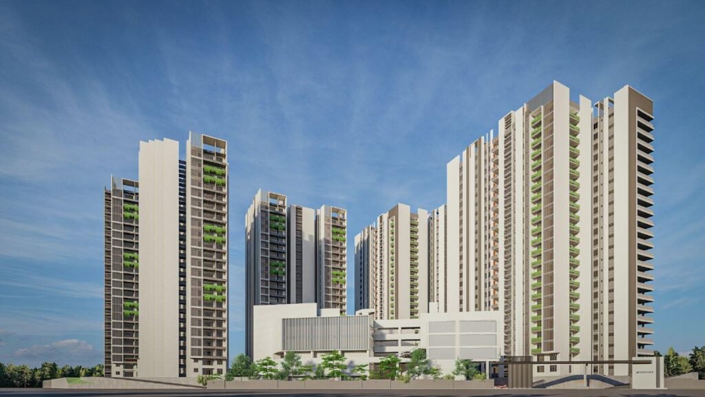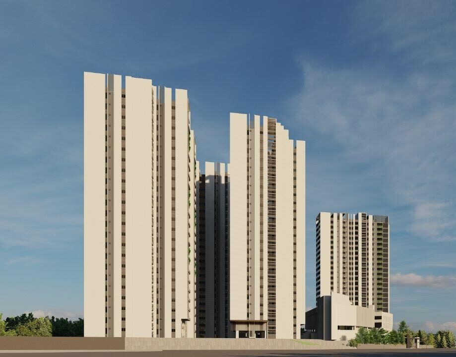 The rise of luxurious vertical living that stands 83.80 meters high is spread across 10.689 acres of integrated township with 5 towers with G+25 Floors and 2 Cellar each. The units are 100% vastu compliant, the blocks are strategically planned with an ample amount of landscape, greenery and natural ventilation around which allows natural light, improves air quality, and thermal comfort which produces a healthy environment for the occupants. The units include 4BHK flats ranging from 3150 sq ft to 4150 sq ft and 3BHK flats of 2200 sq. ft. The zoning of the gated community focuses on the public-private activities, to ensure maximum safety and security being achieved. The towers are a practice of “Mivan structures” a fastest construction technique, the building wholly based on concrete as the primary construction material.